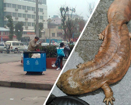 成都火車東站廣場(chǎng)外圍滿了人,大家都好奇地看著在地上爬來爬去的4個(gè)小家伙,它們可不是普通動(dòng)物,而是國(guó)家二級(jí)保護(hù)動(dòng)物——娃娃魚。它們的來歷撲朔迷離,據(jù)說是環(huán)衛(wèi)工在打掃垃圾桶時(shí),從一個(gè)塑料袋里翻出來的,究竟是何人所丟不得而知?,F(xiàn)在4條娃娃魚被送往成都動(dòng)物園,暫未有發(fā)現(xiàn)不適現(xiàn)象。